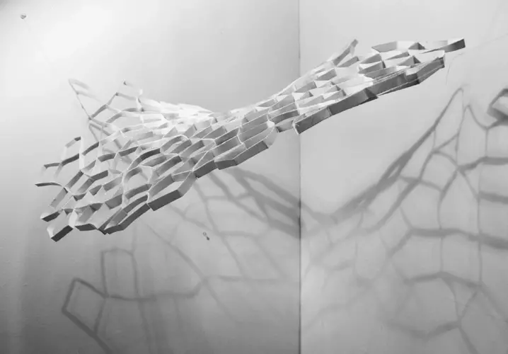 A web of pentagonal and square shaped pieces of paper glued together and strung using fishing wire.The piece is made of a sheet of A3 and a sheet of A4 cartridge paper.